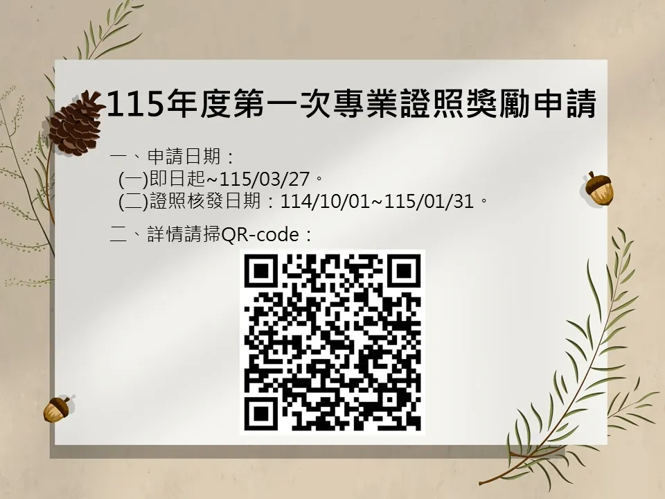 115年度第一次學生申請專業證照獎勵及相關事宜